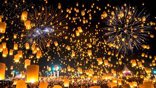 清邁是蘭納王朝的故都,2017年底首屆蘭納文化藝術節將在清邁舉行,跨年夜當天,蘭納古村再現泰國傳統水燈節,現場準備了孔明燈及祈福火種,僧人們為大家手中的天燈祈福。在倒計時的喊聲中,五光十色的煙花燃放,5000個天燈上升到天空,瞬間如銀河般燦爛,煙花綻放,放飛祝福,相信一定會給你一個終身難忘的跨年夜!