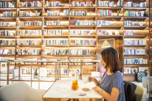 順著金屬裝飾線和雪白大理石的 logo 造型牆,整排落地的大片書牆,是提供給文青訪客最為安靜的悠閒咖啡時光。