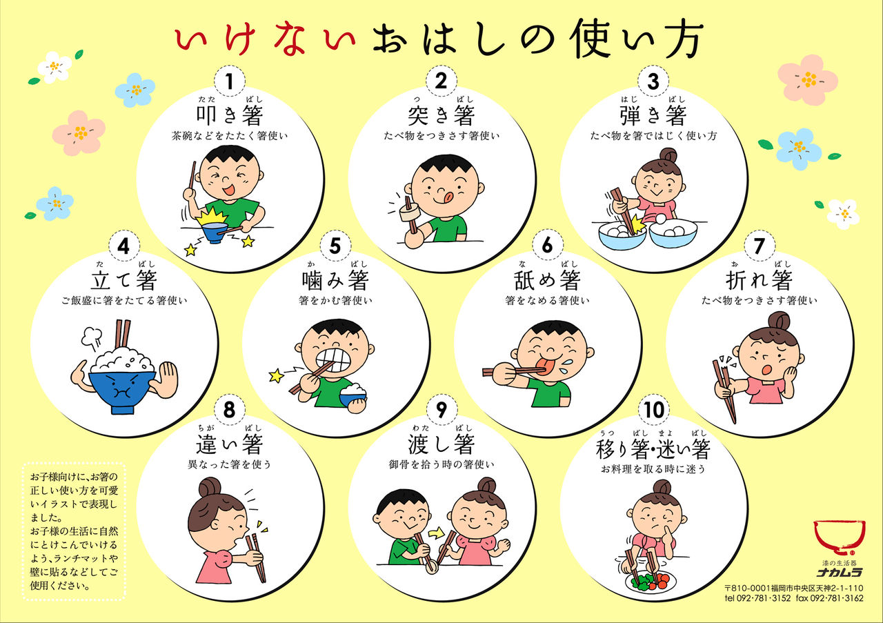 •不要用筷子插進食物,特別是插進米飯裡。只有在葬禮時,才會把筷子插進飯裡並放在死者的靈前。