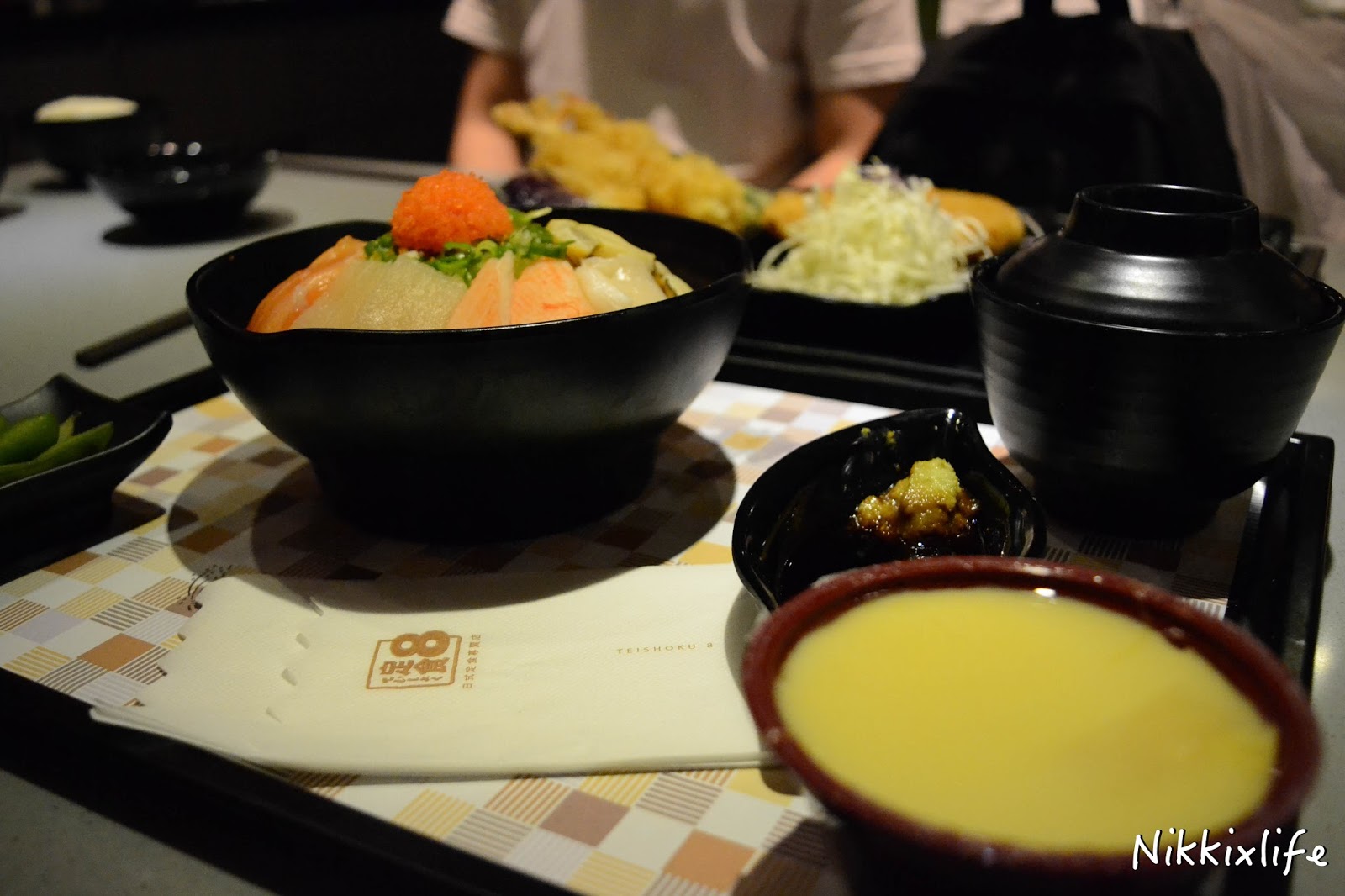 在開張期間內,凡購買$100就會送你$100的優惠券,即是買一送一,計算上來超級抵,難怪大排長龍!雖然有優惠,但食物質素又如何?就等我為大家介紹一下定食套餐吧!其中一個定食是豪華海景丼,擺滿了三文魚、劍魚、鮮蝦、帶子、帆立貝等等刺身食材,三文魚的味道不錯呢~